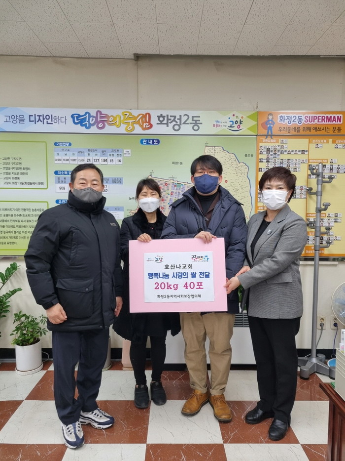 이번 행사는 관내에 위치한 호산나 교회에서 화정2동에 후원한 쌀 800kg(20kg 40포)를 전달하는 자리로 기탁 받은 쌀은 독거노인 등 관내 저소득 취약계층에게 전달될 예정이다.