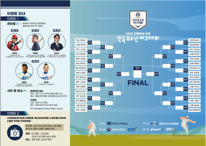 또한, 대회기간 원 포인트 레슨[김민우(전 기아타이거즈 코치), 안경현(한국프로야구은퇴선수협회장), 김선우, 유희관(해설위원), 양준혁(양준혁재단 이사장)]과 사인회가 개최되며, 현장 사진 촬영 및 즉석 인화 행사 등을 통해 참가선수 뿐만 아니라 관람객 모두가 참여하고 즐길 수 있는 다양한 이벤트도 진행될 예정이다.