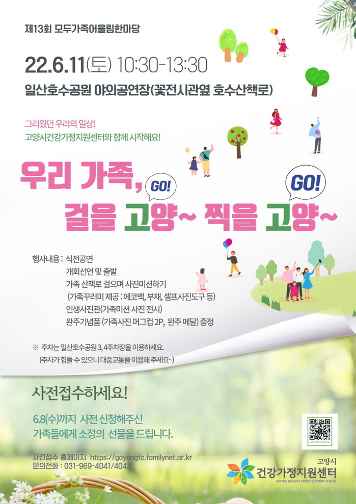 [부자동네타임즈 김인수기자] 고양시건강가정지원센터에서 가정의 달 기념행사로 오는 6월 11일(토) 일산호수공원에서 제13회 모두가족어울림한마당 ‘우리가족, 걸을 고(GO)양~ 찍을 고(GO)양~’ 행사를 개최한다.