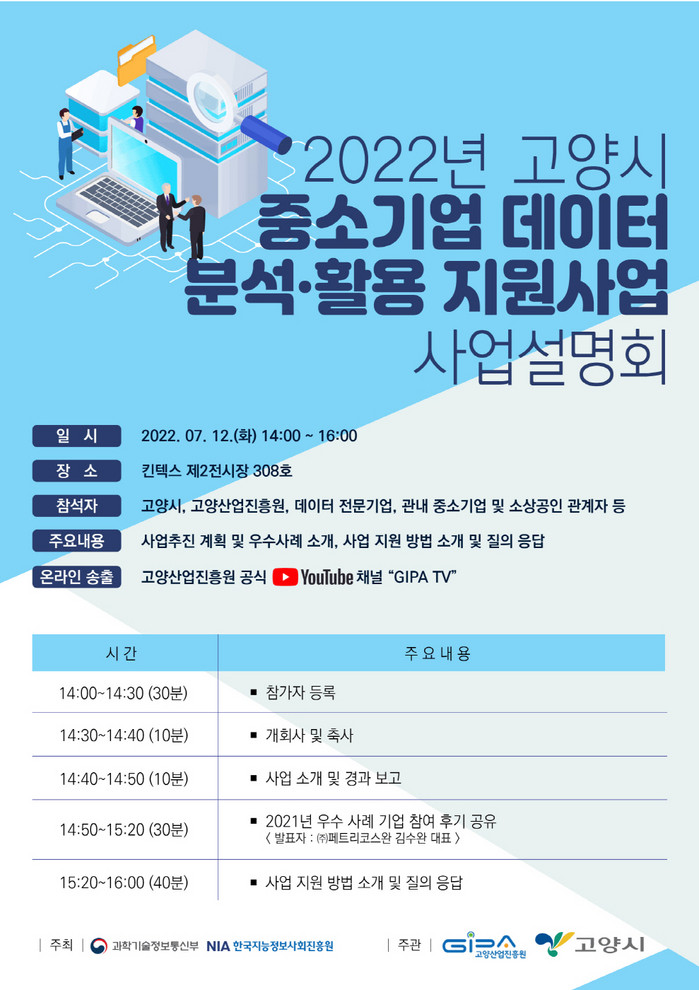 [부자동네타임즈 김인수기자] 고양산업진흥원(원장 오창희)은‘2022년 중소기업 데이터 분석·활용 지원 사업’설명회를 오는 7월 12일(화) 킨텍스 제2전시장 308호에서 개최한다.