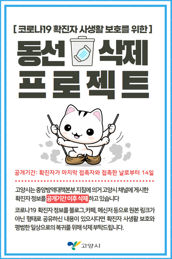 시 관계자는 “우리 시는 정부지침을 준수하고 있지만, 이를 공개기간 이후에도 소장하거나 공유하는 이용자들이 많다. 이를 통해 추가적인 피해가 발생하면서 ‘인터넷 방역단’의 필요성을 절실히 느끼게 됐다. 고양시민의 인권보호에 큰 도움이 되길 기대한다”라고 밝혔다.