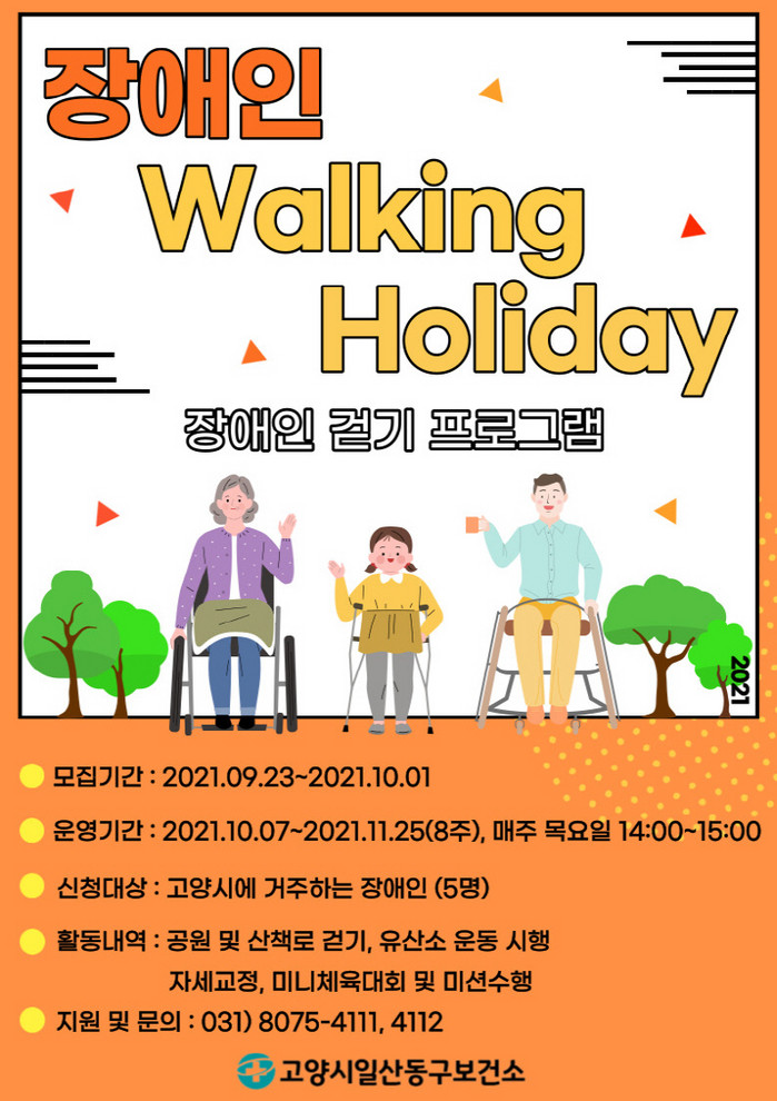 [부자동네타임즈 김인수기자] 고양시 일산동구보건소가 10월 7일(목)부터 장애인의 건강 증진을 위한 ‘워킹홀리데이(Walking Holiday)’ 프로그램을 운영한다.