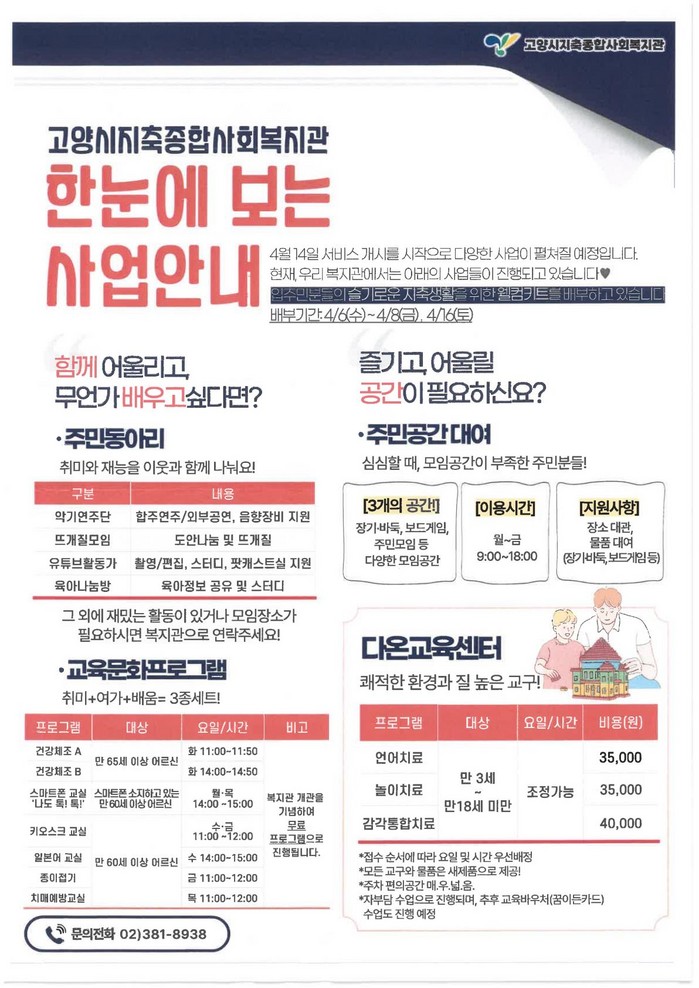 [부자동네타임즈 김인수기자] 고양시 지축종합사회복지관(관장 송미령)이 4월 14일(목)부터 지역주민에게 주요 복지 서비스를 개시한다고 밝혔다.