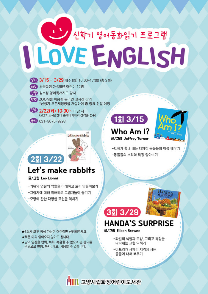 [부자동네타임즈 김인수기자] 고양시 화정어린이도서관이 오는 3월 새 학기를 맞아 영어동화읽기 프로그램인 I LOVE ENGLISH를 운영한다.