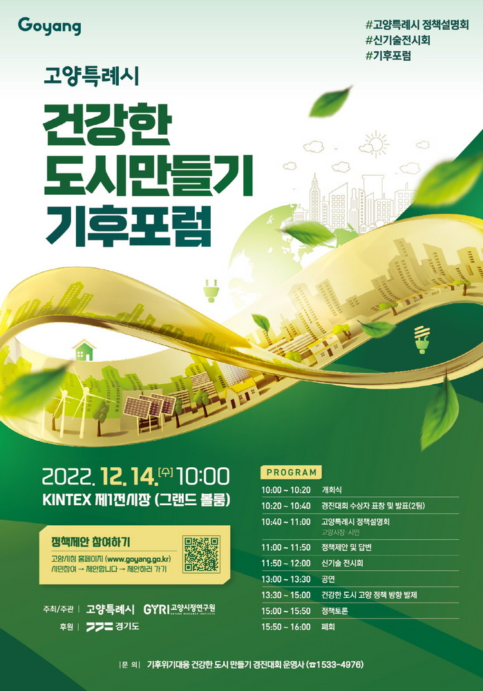 포럼은 개회식, 건강한 도시 만들기 전국 경연대회의 입상작 발표, 이동환 고양특례시장의 정책설명회와 도시 자연재난 문제 해법을 위한 정책토론회로 진행된다.