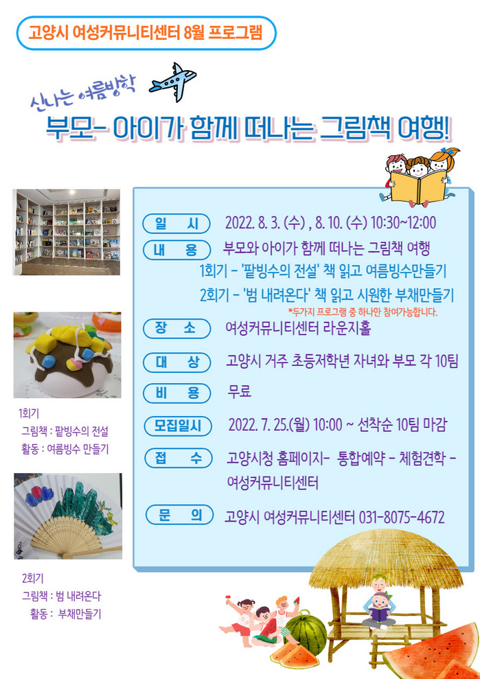 [부자동네타임즈 김인수기자] 고양시 여성커뮤니티센터에서 여름방학을 맞이하여 오는 8월 3일과 10일 총 2회에 걸쳐 ‘부모와 자녀가 함께 떠나는 그림책 여행 ’을 진행한다.