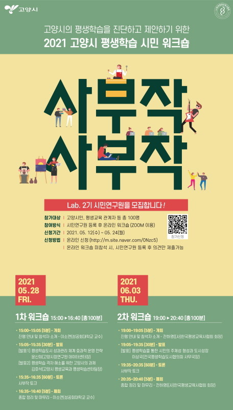 [부자동네타임즈 김인수기자] 고양시는 시민이 중심이 돼 고양시의 평생학습을 진단·제안하는 ‘사부작사부작 Lab. 2기 시민 워크숍’을 운영, 이달 24일까지 시민연구원 100명을 모집한다.