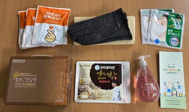 꾸러미는 ▲건강관리물품(찜질팩, 파스) ▲방한용품(핫팩, 장갑) ▲코로나19 예방물품(마스크와 핸드워시) 등으로 구성되어 있다.