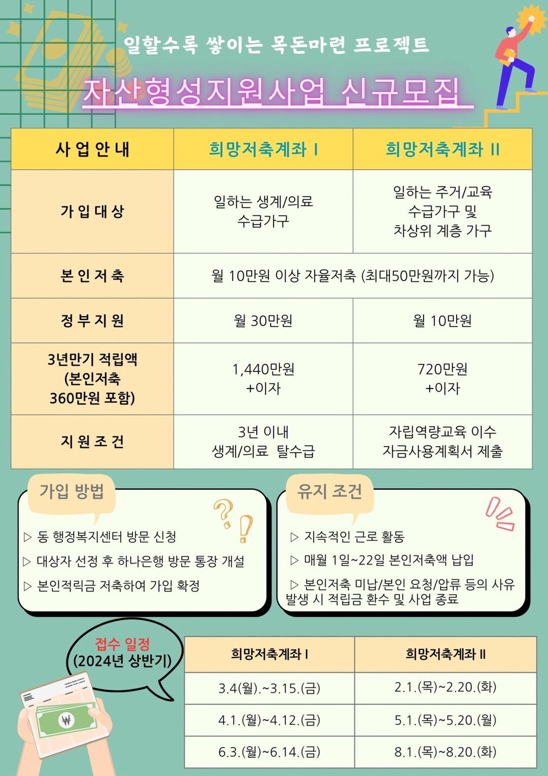자산형성지원 통장사업은 근로소득이 있는 수급자와 차상위계층 대상자가 자립에 필요한 자산을 형성할 수 있도록, 가입기간 3년 동안 본인 저축액에 근로소득장려금을 매칭해 적립함으로써 목돈을 마련할 수 있게 하는 사업이다.