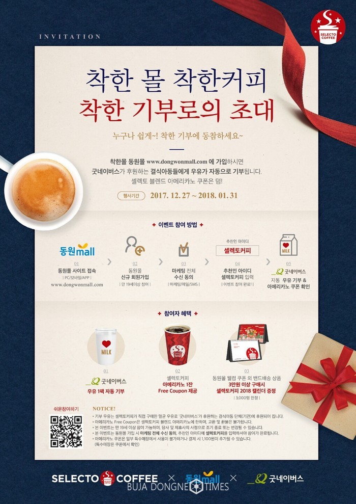 동원몰은 내년 1월 31일까지 신규 가입하는 가입자수 만큼의‘덴마크 무항생제인증목장우유’를굿네이버스 결식 아동들에 기부한다. 또한 신규 가입자들에게는 기부의 기쁨과 함께셀렉토커피블렌드아메리카노 쿠폰도 증정한다. 참여방법은, 동원몰 신규가입 시 추천인아이디란에‘셀렉토커피’를 입력하면 된다.