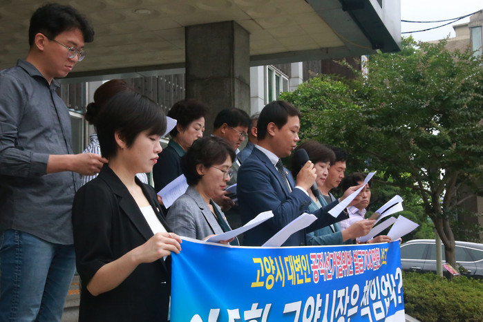 [사진설명] 고양시의회 더불어민주당 의원 일동은 고양시청 정문에서 성명서를 발표하고 있다.