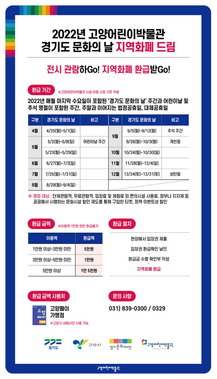 [부자동네타임즈 김인수기자] 고양시 산하 고양어린이박물관(관장 조현영)이 작년에 이어 경기도·경기문화재단과 함께 ‘2022 경기도 문화의 날, 지역화폐 드림’사업을 진행한다.