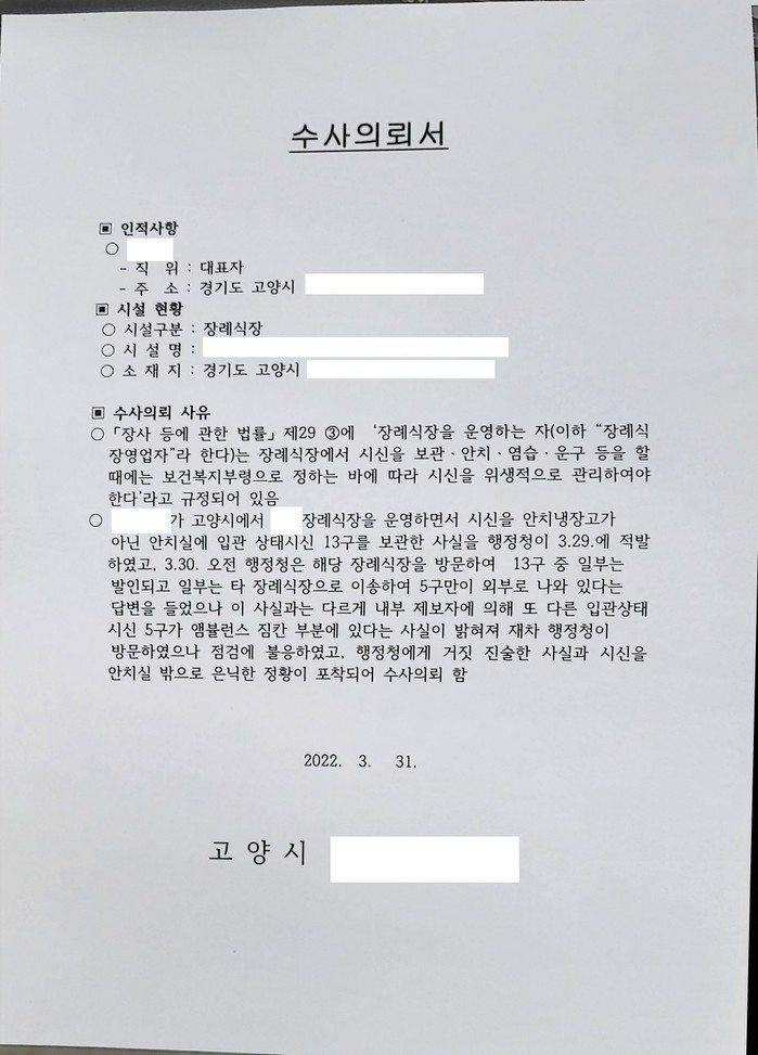 [부자동네타임즈 김인수기자] 30일 시신이 든 관을 차량 안에 숨겼다가 적발돼 언론에 보도된 A장례식장에 대해 고양시가 31일 복지여성국장이 직접 긴급점검을 실시하고 수사의뢰 했다고 이날 밝혔다.