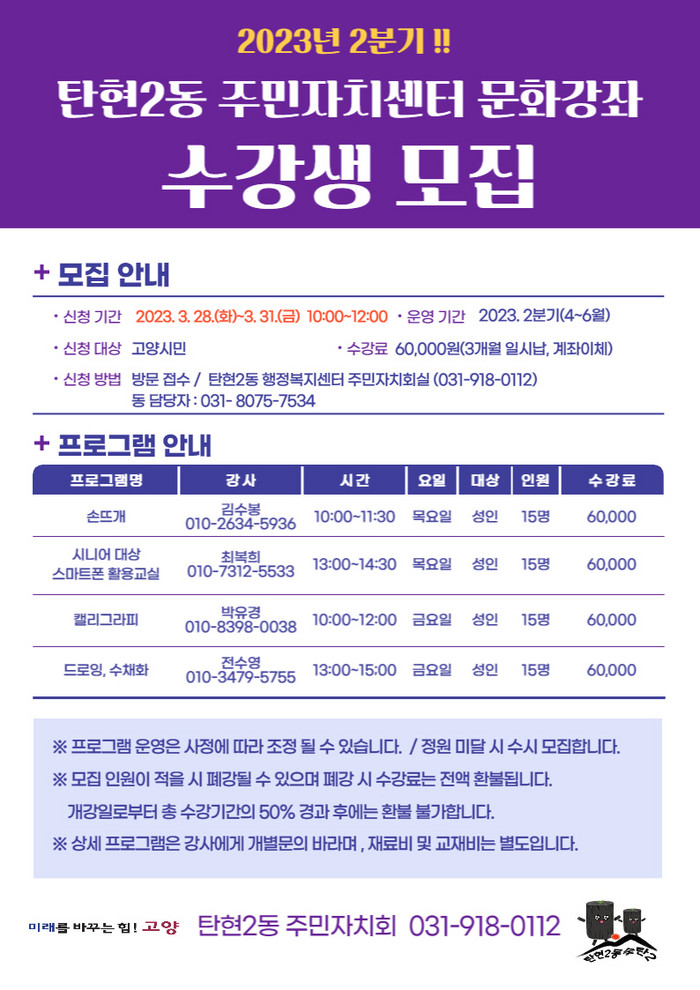 수강생 모집기간은 오는 3월 28일부터 31일까지 선착순으로 모집하며, 탄현2동 주민자치회실에 방문접수하면 된다.
