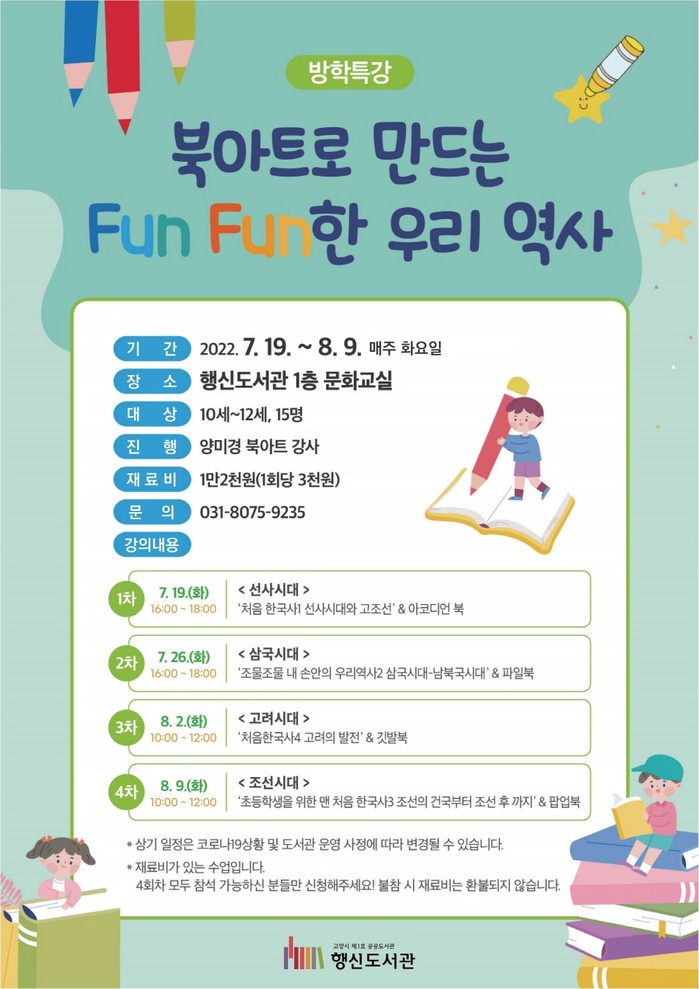 [부자동네타임즈 김인수기자] 고양시(시장 이동환) 행신도서관이 7월 19일(화)부터 8월 9일(화)까지 초등학생 대상 여름방학특강 북아트로 만드는 FunFun한 역사이야기 운영한다.