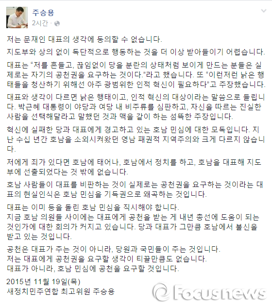 | △ 주승용 새정치민주연합 최고위원 페이스북 게시글. <사진출처=주승용 최고위원 페이스북> |