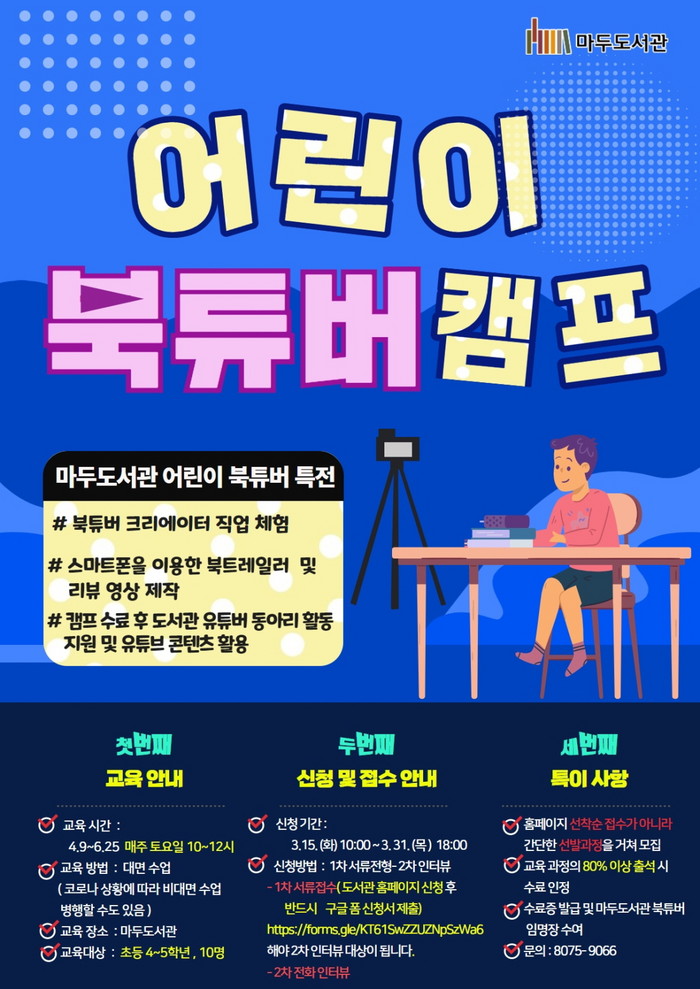 [부자동네타임즈 김인수기자] 고양시 마두도서관이 오는 4월 9일부터 6월 25일까지 매주 토요일 어린이 북튜버 캠프 2기를 운영한다.