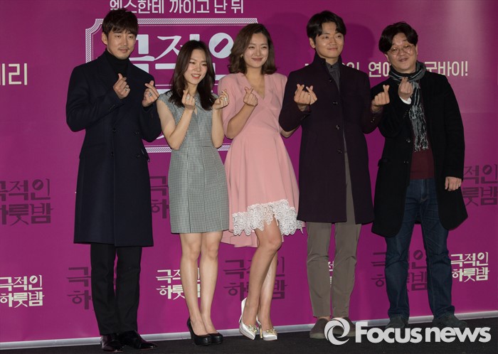 (서울=포커스뉴스) 25일 오후 서울 성동구 왕십리 CGV에서 열린 영화 '극적인 하룻밤' 언론시사회에 참석한 배우 윤계상(왼쪽부터), 한예리, 정수영, 조복래와 영화감독 하기호가 포토타임을 갖고 있다.