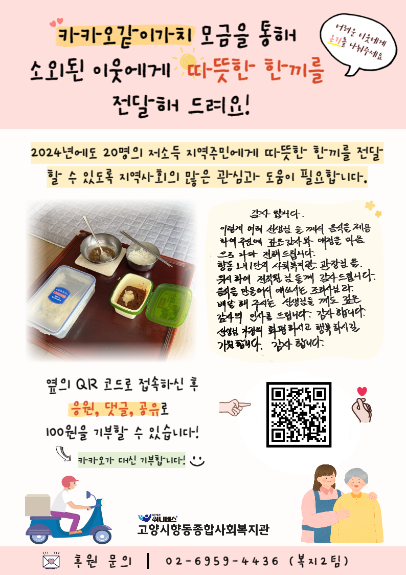 한편 고양시향동종합사회복지관에서는 밑반찬 지원 사업 재원 마련을 위해 현재 온라인 모금 플랫폼 ‘카카오같이가치’에서 2024년 2월 23일까지 활발한 모금 활동을 진행 중이다.