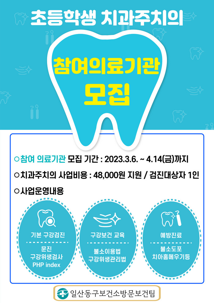 [부자동네타임즈 김인수기자] 일산동구보건소는 경기도 초등학생 치과주치의 사업에 참여할 치과 병·의원을 이달 6일부터 다음달 14까지 공개 모집한다.
