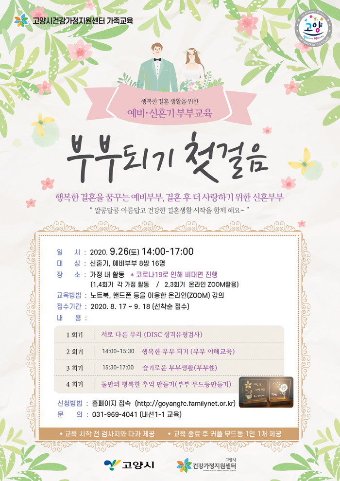 코로나19로 인해 비대면 교육으로 진행될 이번 교육은 예비부부(커플), 결혼 5년 이하의 신혼기 부부 8쌍을 대상으로 오는 9월 26일 오후 2시부터 5시까지 ZOOM을 활용해 온라인으로 진행된다.
