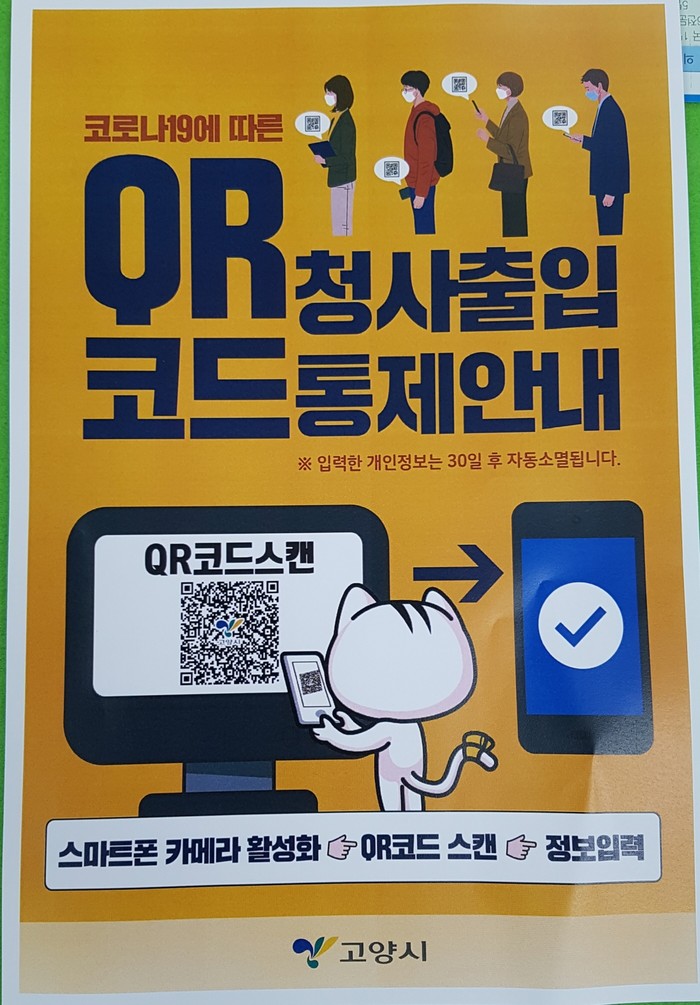 지난 5월 6일 이태원클럽 등에서 집단감염이 발생했을 때 참석자들 중 일부가 거짓 인적사항을 남기면서 확진자 · 접촉자 등의 파악에 어려움을 겪게 됐고, 고양시는 방문자들의 정확한 인적사항 관리에 주목했다. 시청 본관을 포함한 대부분의 청사와 산하기관들에서는 이미 QR코드가 도입돼 운영 중이고, 고양시는 QR코드 시스템을 민간 부문까지 전역 보편화하기 위해 애쓰고 있다.