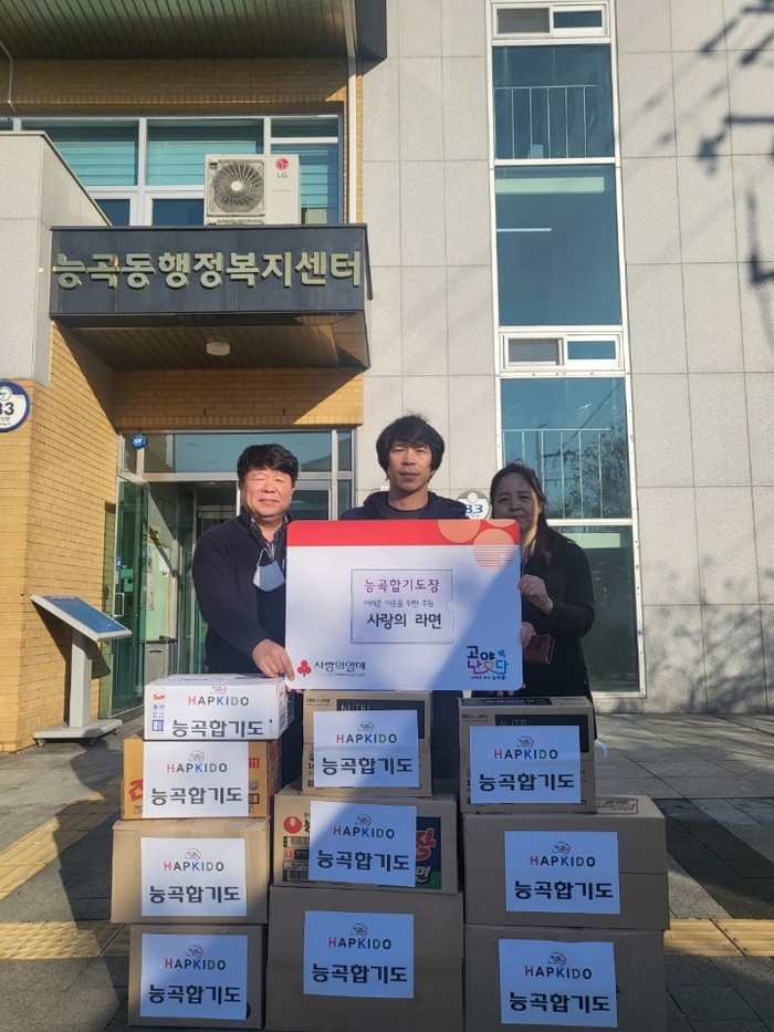 후원품은 연말을 맞아 능곡합기도장에서 어려운 이웃을 돕기 위한 행사를 실시해 원생들 각자 집에서 라면을 가져와 십시일반 모은 것이다. 박스 안에는 원생들 수만큼 다양한 종류의 라면이 원생들의 정성과 마음을 나타내 듯 다채로운 색상을 보이며 빼곡히 들어 있었다.