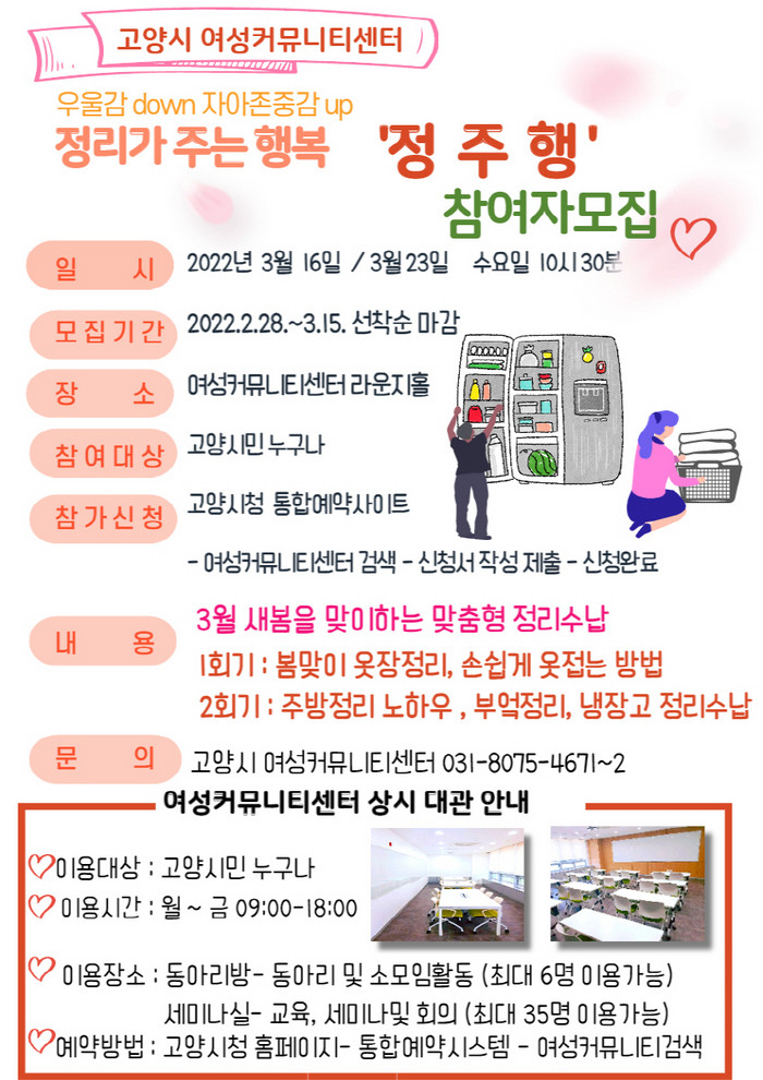 [부자동네타임즈 김인수기자] 고양시 여성커뮤니티센터(이하 센터)가 2월 28일(월)부터 3월 15일(화)까지 새봄을 맞이하여 맞춤형 정리 프로그램 정리가 주는 행복 ‘정·주·행’의 참여자를 모집한다.