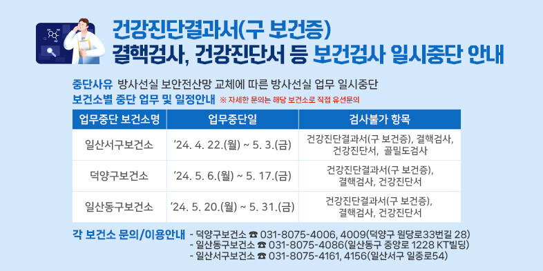 [부자동네타임즈 = 김인수 기자] 고양특례시는 4월 22일부터 5월 31일까지 6주간 3개구 보건소의방사선실 보안지원 운영체제 순차적 교체로 건강진단결과서(구, 보건증) 및 결핵검진 등 방사선실 업무를 일시 중단한다고 밝혔다.