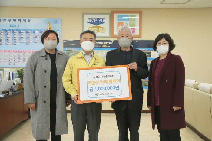 김운영 덕양구청장은 “지역 내 저소득층을 위해 따뜻한 나눔을 실천해 주신 북한산 카페 플레이에 감사의 마음을 전한다”며 “이 기부금은 도움이 필요한 분들에게 잘 전달하겠다”고 말했다.