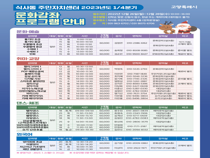 [부자동네타임즈 김인수기자] 고양특례시 식사동 주민자치회(회장 이수광)는 지난 26일부터 2023년 1분기 주민자치센터 문화강좌 프로그램 수강생을 모집하고 있다고 밝혔다.