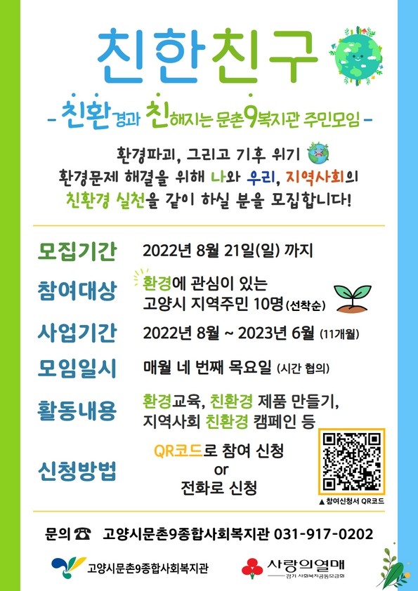 [부자동네타임즈 김인수기자] 고양시문촌9종합사회복지관(관장 김신실)에서 2022년 8월부터 2023년 6월까지 ‘친한친구: 친환경과 친해지는 문촌9복지관 주민모임’ 사업을 진행한다.