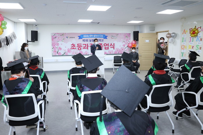 [부자동네타임즈 김인수기자] 고양시는 지난 25일 원흥평생학습센터에서 학력인정 초등과정 졸업생 17명의‘제1회 높빛희망학교 초등과정 졸업식’을 개최했다.
