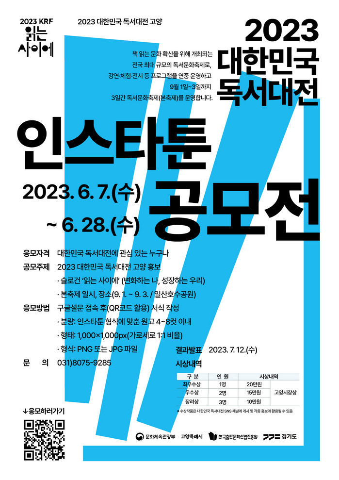 공모전은 독서대전 슬로건 ‘읽는 사이에(변화하는 나, 성장하는 우리)’와 본축제 기간(9. 1.~9. 3.)과 장소인 일산호수공원 등 독서대전과 관련된 내용을 반영하여 2023 대한민국 독서대전 고양 홍보를 주제로 인스타툰을 그려 누구나 자유롭게 참가할 수 있다.