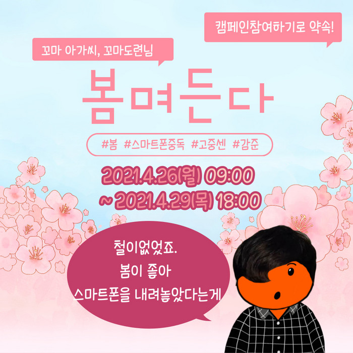 [부자동네타임즈 김인수기자] 고양시에서 민간 위탁·운영 중인 고양시중독관리통합지원센터에서는 이달 26일부터 29일까지 스마트폰 중독 예방 온라인캠페인‘봄며든다’를 시행한다.