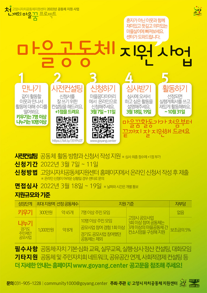 [부자동네타임즈 김인수기자] 고양시 자치공동체 지원센터(센터장 권명애)가 공동체 활동 확산을 위해 2022년 마을공동체 지원 사업 공동체를 모집한다.