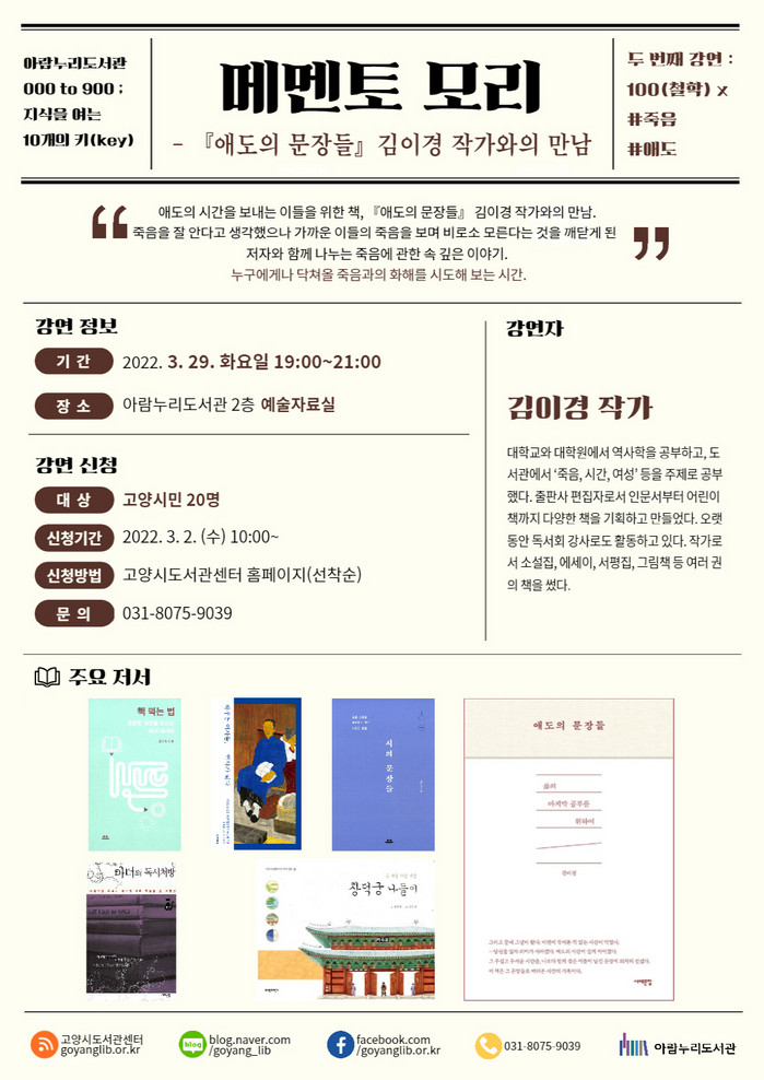 [부자동네타임즈 김인수기자] 고양시 아람누리도서관은 오는 3월 29일(화) 오후 7시 독서문화프로그램 ‘메멘토 모리’를 운영한다. 누구에게나 닥쳐올 ‘죽음’에 대해 철학적인 접근을 시도하는 독서문화프로그램이다.