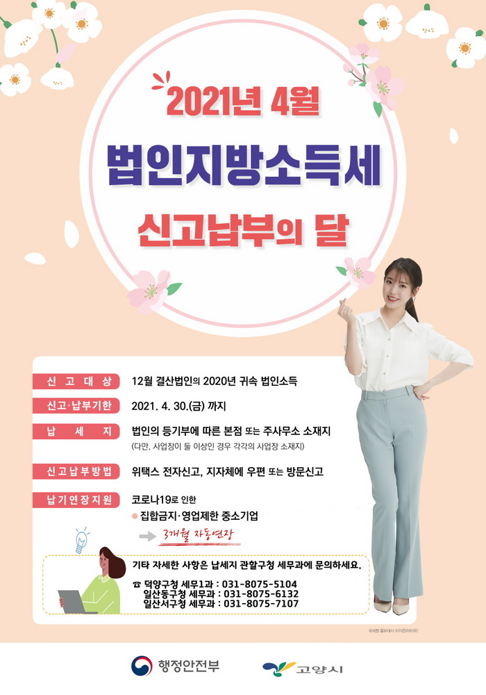 [부자동네타임즈 김인수기자] 고양시는 "오는 4월 30일까지 2020년 귀속분 법인지방소득세 신고를 받는다."고 밝혔다.