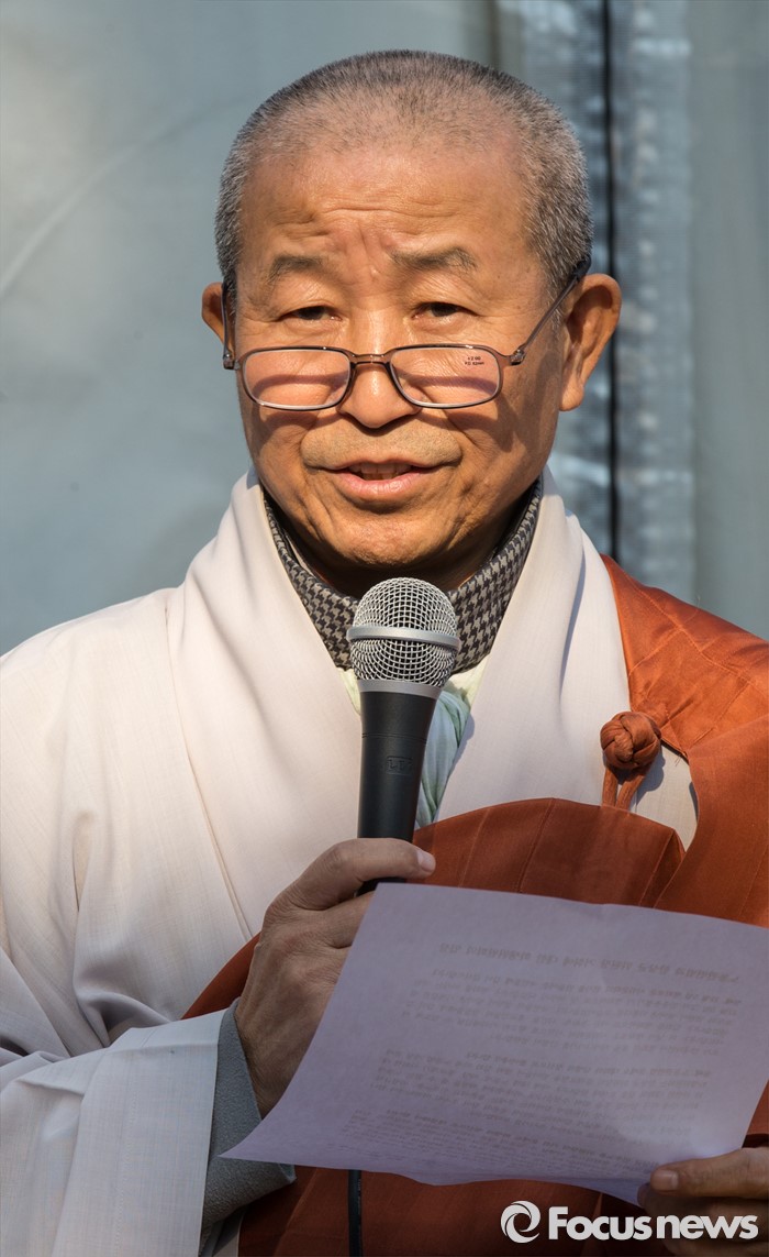 | △ 8일 오전 서울 종로구 조계사에서 대한불교조계종 화쟁위원회 위원장인 도법 스님이 회견문을 읽고 있다. <사진제공=포커스뉴스> |