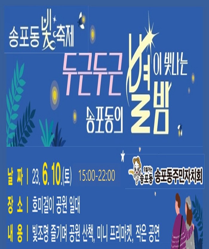 [부자동네타임즈 김인수기자] 고양특례시 송포동 주민자치회는 오는 6월 10일 오후 3시부터 10시까지 송포동 호미걸이 공원에서 ‘빛축제-두근두근 송포동의 별이 빛나는 밤에’를 개최할 예정이다.