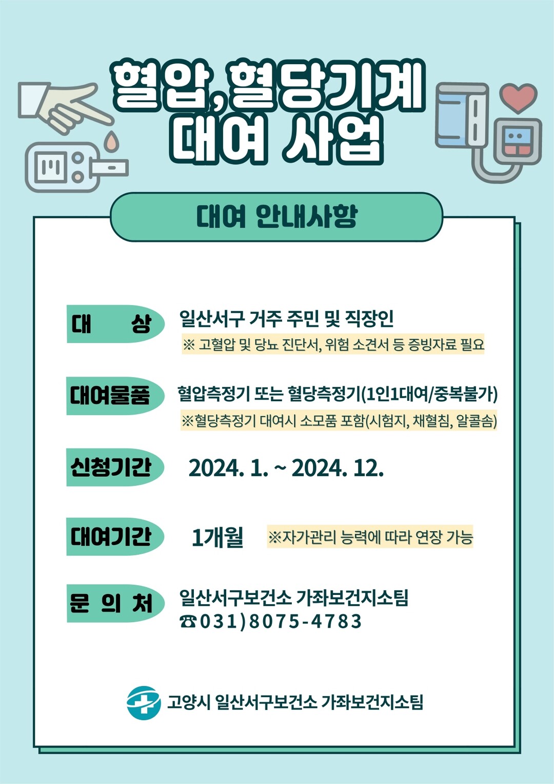 혈압‧혈당기 대여를 원하는 관내 주민 및 직장인은 일산서구보건소 카카오톡 채널에서 관련 내용을 확인할 수 있으며 가좌보건지소팀(☎031-8075-4783)으로 문의하면 된다.