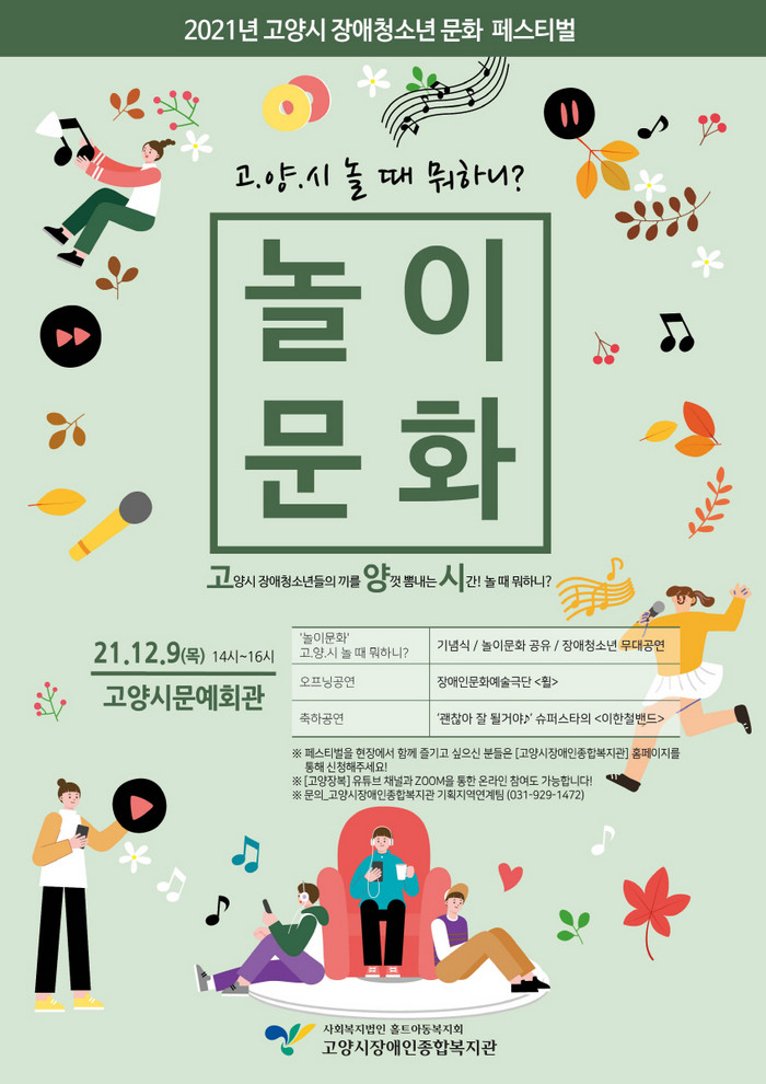 [부자동네타임즈 김인수기자] 고양시가 12월 9일(목) 오후 2시 고양문예회관에서 2021년 고양시 장애청소년 문화 페스티벌 ‘놀이문화’를 개최한다.