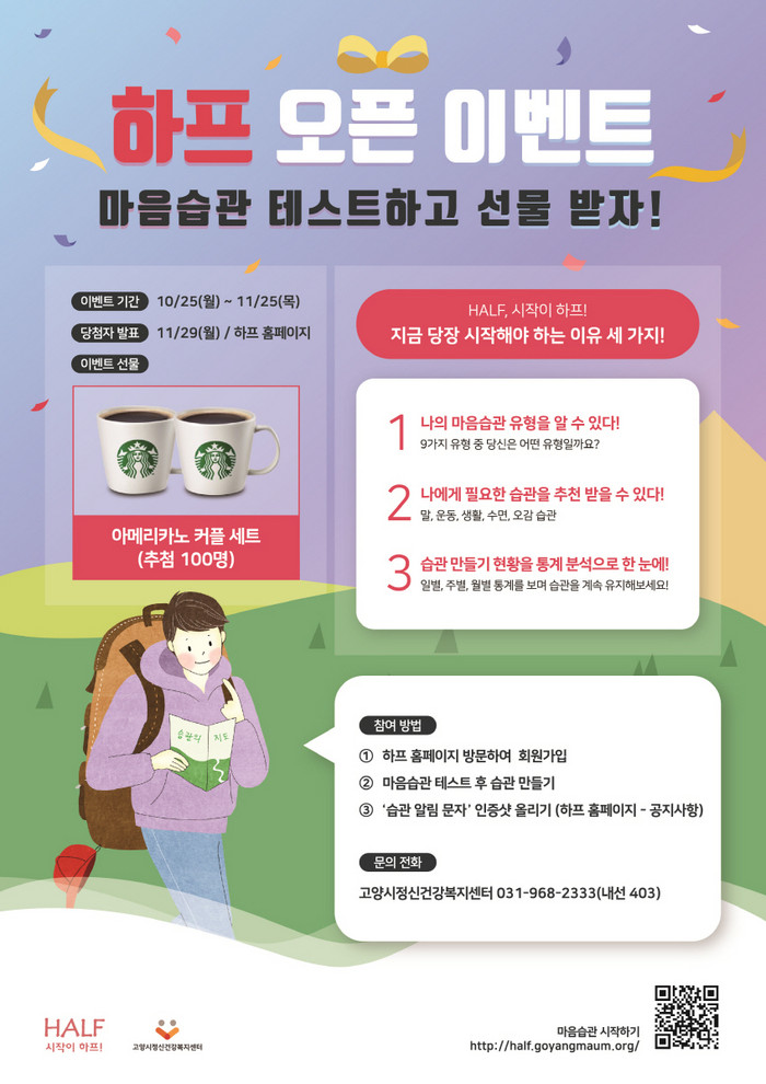 오픈 이벤트 참여 방법은 하프 홈페이지 회원가입, 마음습관 테스트 후 습관 일정 만들기, 습관 알림 문자를 캡처하여 게시판 댓글로 응모하면 된다. 이벤트는 누구나 참여할 수 있으며, 총 100명을 추첨하여 모바일 상품권을 제공한다.