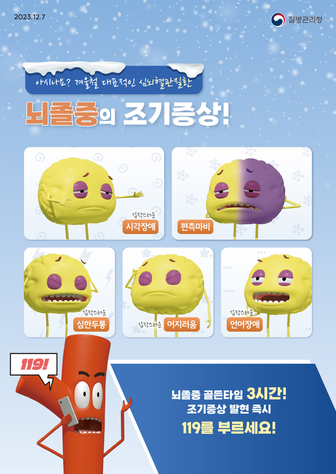특히 겨울철은 급격한 기온 변화로 심뇌혈관질환 위험성이 다른 때보다 높은 계절로, 겨울철 대표적인 심뇌혈관질환인 심근경색과 뇌졸중의 조기증상을 미리 숙지하고 대비하는 자세가 필요하다.