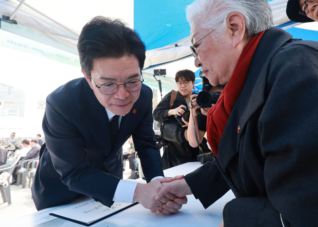 더불어민주당 정원오 서울시장 예비후보가 3일 서울 종로구 송현광장에 마련된 제주 4·3 제78주년 희생자 추모비에 헌화한 뒤 관계자와 인사하고 있다. 2026.4.3