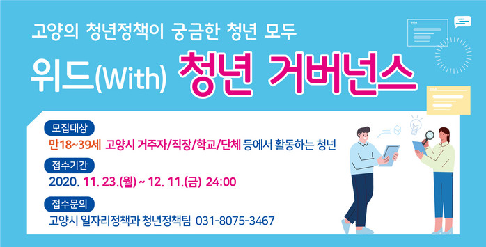 이번에 모집하는 위원은 출범 3기를 맞는 내년도 고양시 청년정책협의체에서 활동할 청년 위원 50명이다.