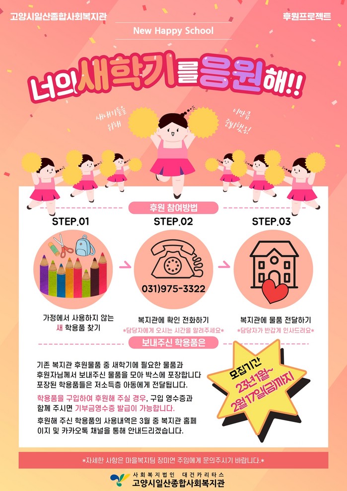 [부자동네타임즈 김인수기자] 고양시 일산종합사회복지관에서 새학기를 맞아 1월 16일부터 2월 17일까지 학용품 나눔 캠페인 ‘너의 새학기를 응원해’를 진행한다.