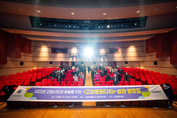 고양문화다리 성과공유회는 지난 14일(수) 고양어울림누리 별모래극장에서 ‘2022 고양시 문화예술진흥 공모사업 고양문화다리’에 참여한 ▲주요 지역예술단체 하랑씨어터 ▲유기농문화예술창작소 ▲더재즈앰버서더스 ▲창크리에이티브 ▲창작놀터극단’야‘ ▲강윤선고양댄스컴퍼니 ▲일산여성합창단 ▲고양시남성합창단 ▲고양아람오페라단 ▲일산미술협회 ▲고양시원로작가회 ▲고양민화협회 ▲음악그룹 오롯 등 53개 단체의 예술인과 개인 예술인이 참석하여 성과물을 공유하고 소통하며 한 해를 마무리하였다.