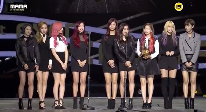 | △ 2일 홍콩 AWE에서 열린 '2015 엠넷 아시안 뮤직 어워즈(2015 MAMA; Mnet Asian Music Awards)'에서 트와이스는 데뷔곡 ‘우아하게(OOH-AHH하게)’로 신인상을 받았다. <사진=엠넷 '2015 MAMA' 방송 캡처> |