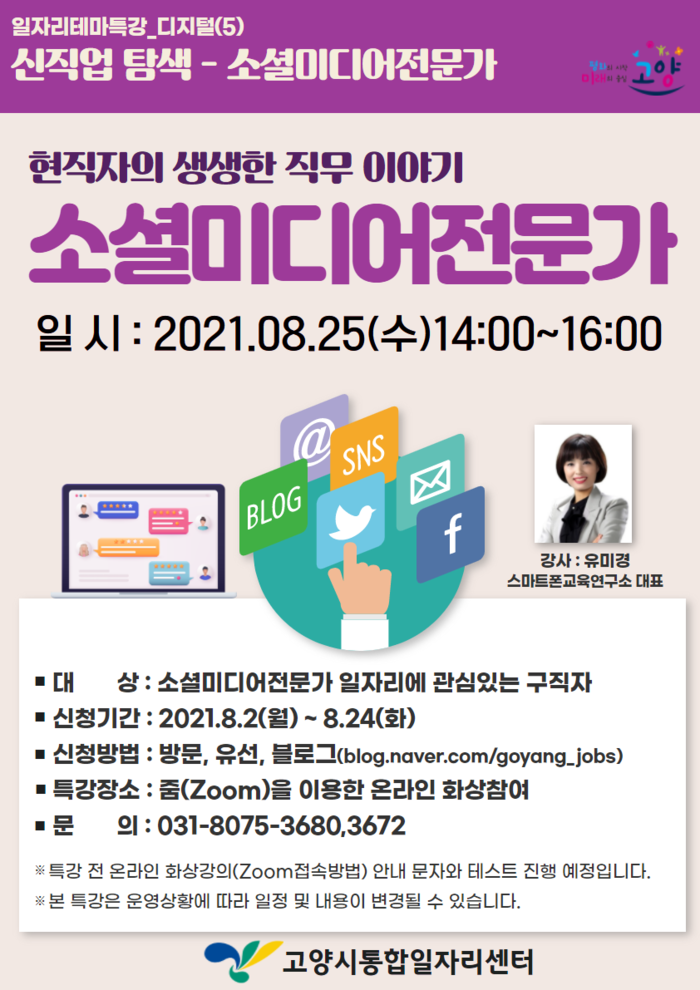 신중년의 온라인 교육 수요가 점차 늘고 있는 가운데, 이달 25일에는 소셜미디어전문가로 활동하는 현직자의 직무 이야기 또한 일자리테마특강으로 준비되어 있어 기대를 모으고 있다.